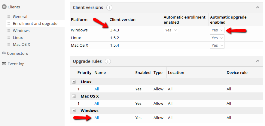 Automatic upgrade feature for Windows platform must be enabled from System Settings > Clients > Enrollment and upgrade. After that, the system upgrades Miradore Windows clients automatically based on the rules defined in the Upgrade rules table (see picture below).