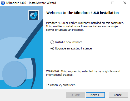 Miradore installer can be used both to install new Miradore server and to upgrade existing servers. For upgrading an existing server, see also Upgrade notes.
