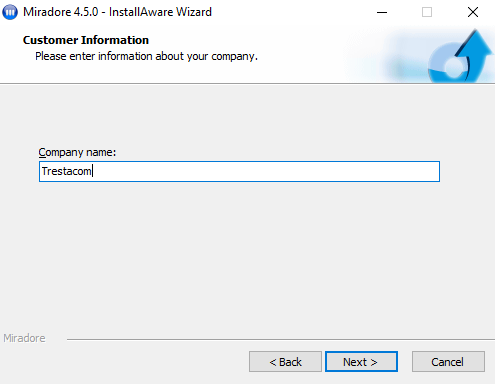 Enter company name. The company name will be displayed in the login screen of Miradore and also in the top of Miradore user interface. In initial installation, Company name is used as Full name and Organization for installed Windows computers. The company name can be changed later if necessary.