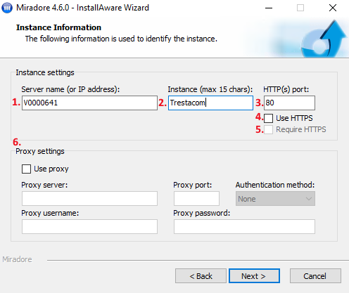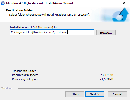 Select destination folder for installation (default folder recommended: C:\Program Files (x86)\Miradore\Server\<Instance name>).