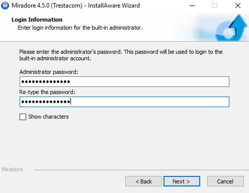 Enter the administrative password. This will be the password for the default administration account (Login name: Administrator). The account is included in the built-in administrators group and can be used to log in to Miradore for the first time.
