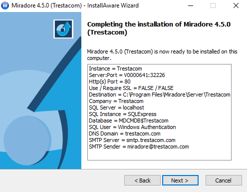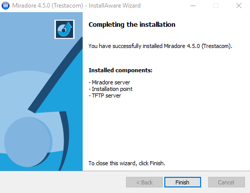 Review information and start installation. The installer writes a log file to folder %windir%\temp\Miradore for problem solving purposes.